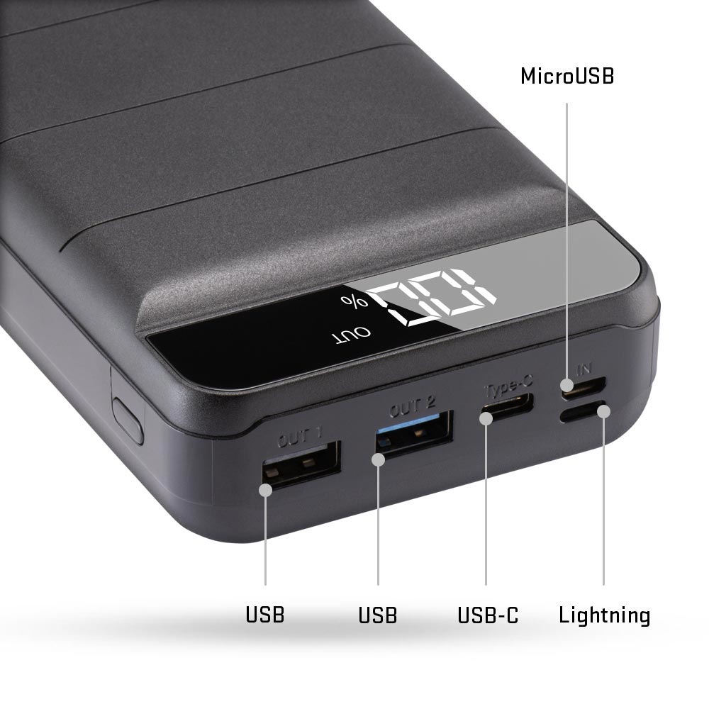 Három különböző USB bemeneti port található a hordozható akkumulátoron, melyek segítségével szinte bármilyen kábel segítségével feltöltheted. Többé nem kell aggódnod, hogy melyik kábel van veled. (Micro USB / USB C / Lightning)