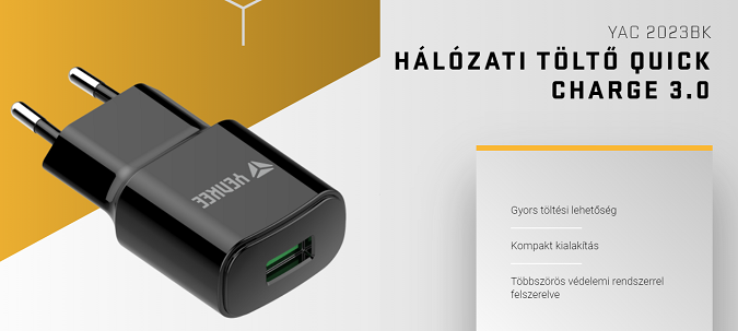 A Yenkee YAC 2023BK hálózati töltő egy USB aljzattal lett felszerelve, amely Quick Charge 3.0 technológiával lett felszerelve, így akár 4x gyorsabban tudod feltölteni a különböző elektronikai készülékeidet. A YAC2023WH akár 3 Amperes teljesítményre is képes.